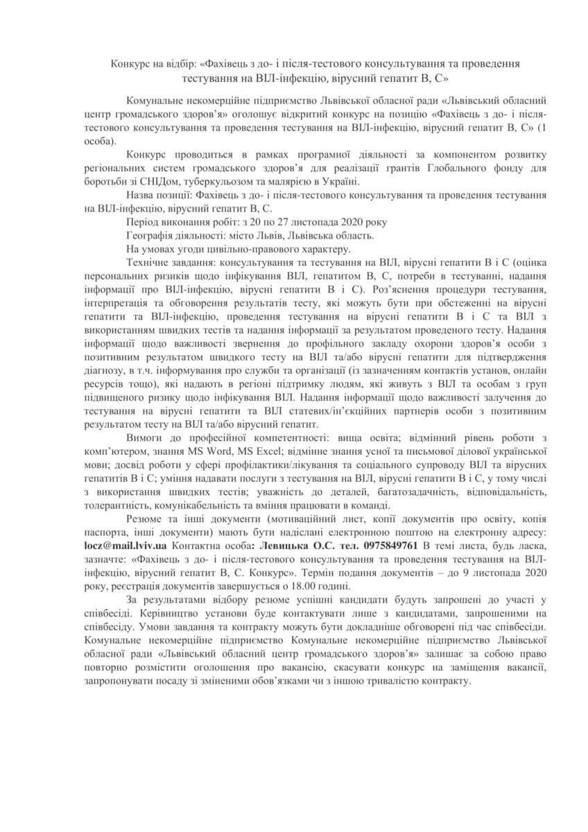 Комунальне некомерційне підприємство Львівської обласної ради «Львівський обласний центр громадського здоров’я» оголошує відкритий конкурс на позицію «Фахівець з до- і після-тестового консультування та проведення тестування на ВІЛ-інфекцію, вірусний гепатит В, С» (1 особа).