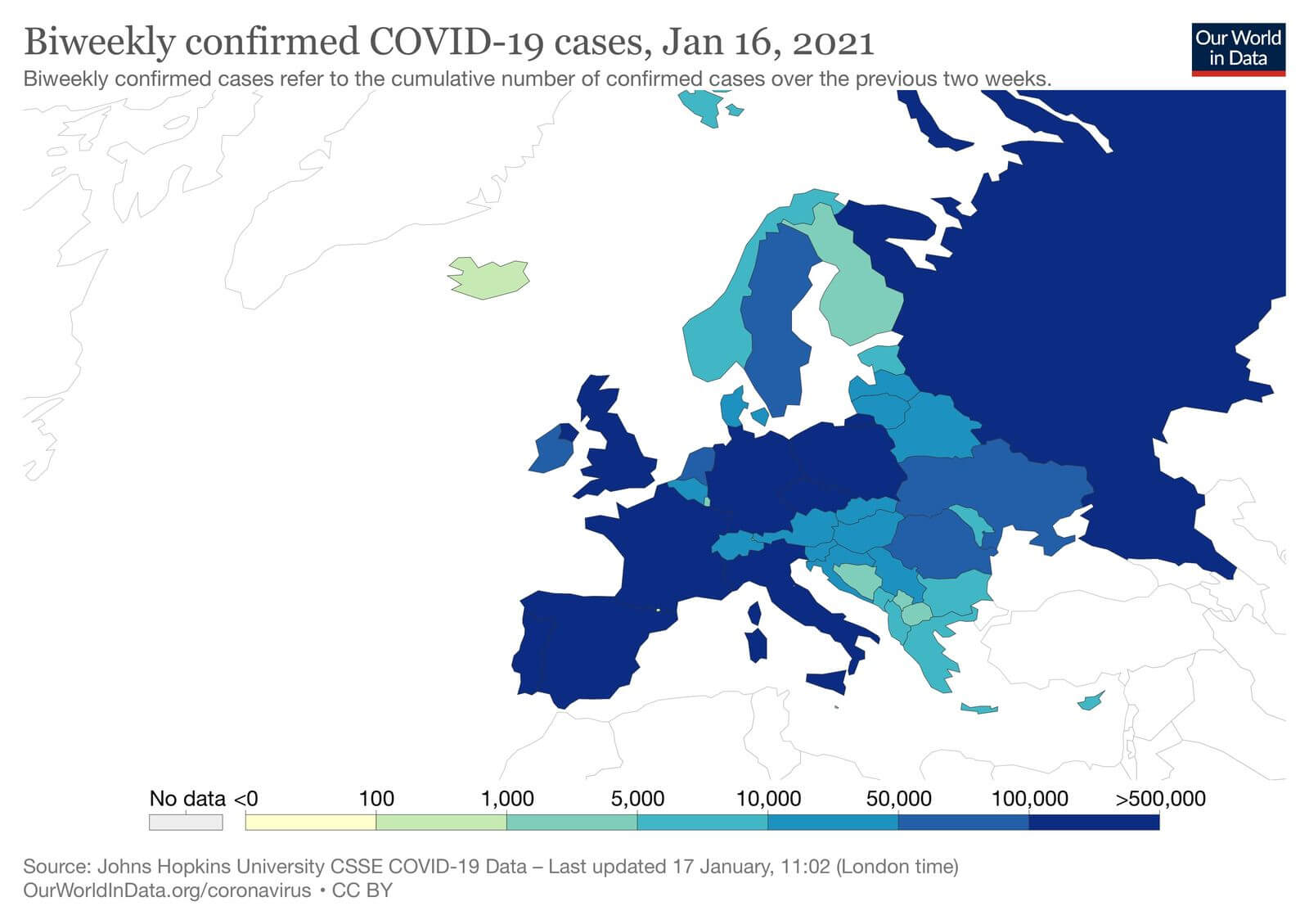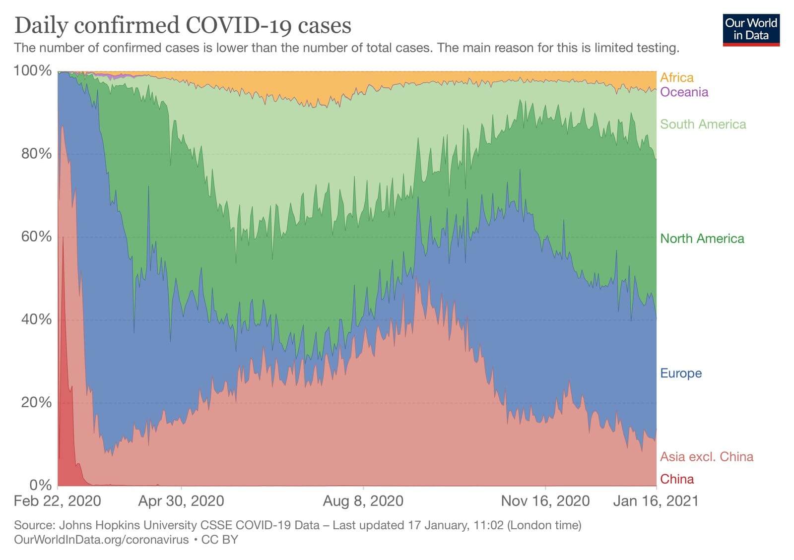 Практично впродовж тижня Європа денно звітує про меншу кількість випадків за Північну Америку (станом на 16 січня 26% нових випадків припадає на Європу і 38% - на Північну Америку).