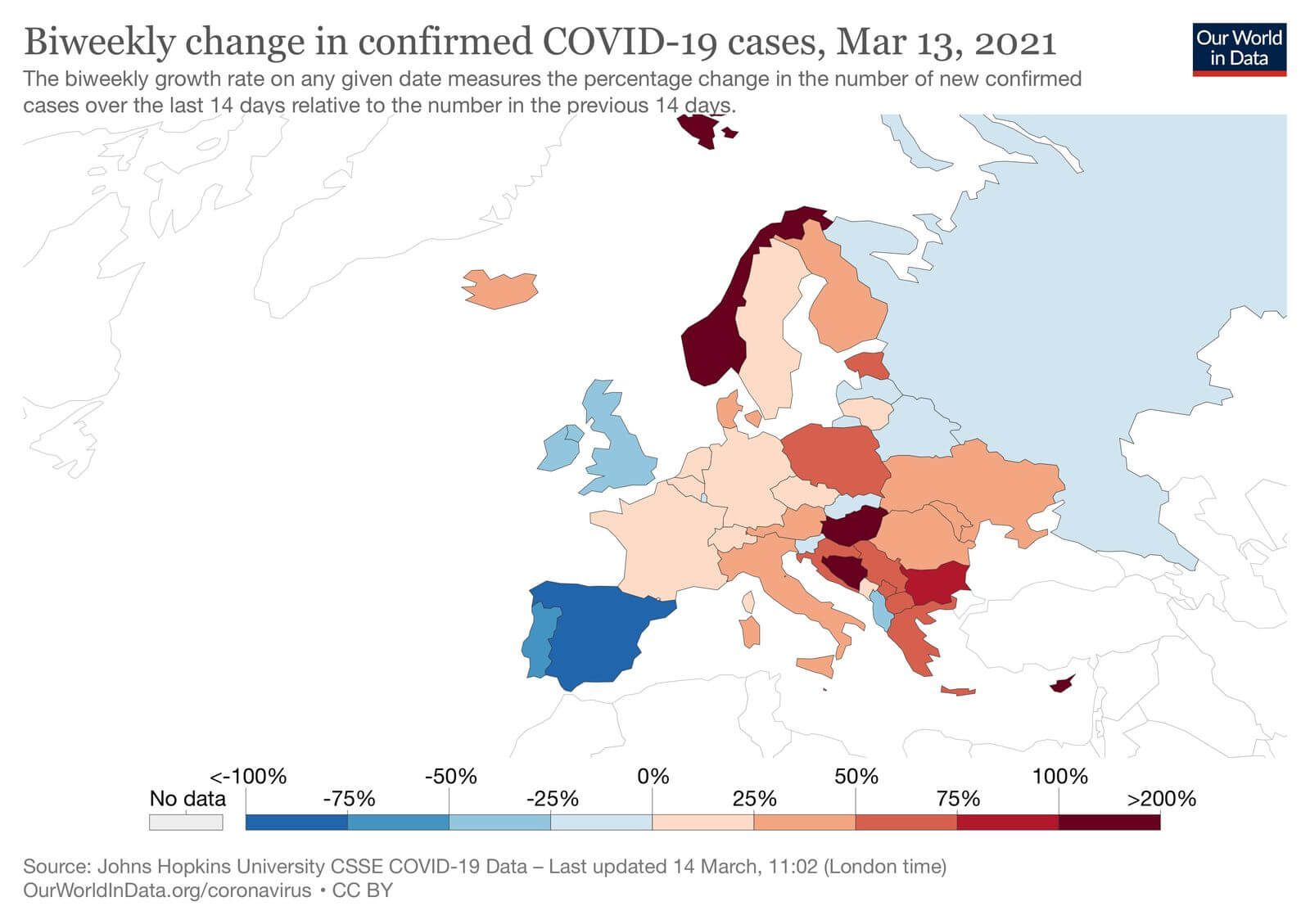 Серед країн Європи, які впродовж останніх двох тижнів показали найбільший ріст — Угорщина, Норвегія, Боснія і Герцеговина. Проте уже є країни, які почали показувати тенденцію до зменшення кількості випадків — це Іспанія, Португалія, Великобританія, Словаччина, Словенія, Албанія. Україна — серед країн, які продовжують нарощувати кількість виявлених випадків.