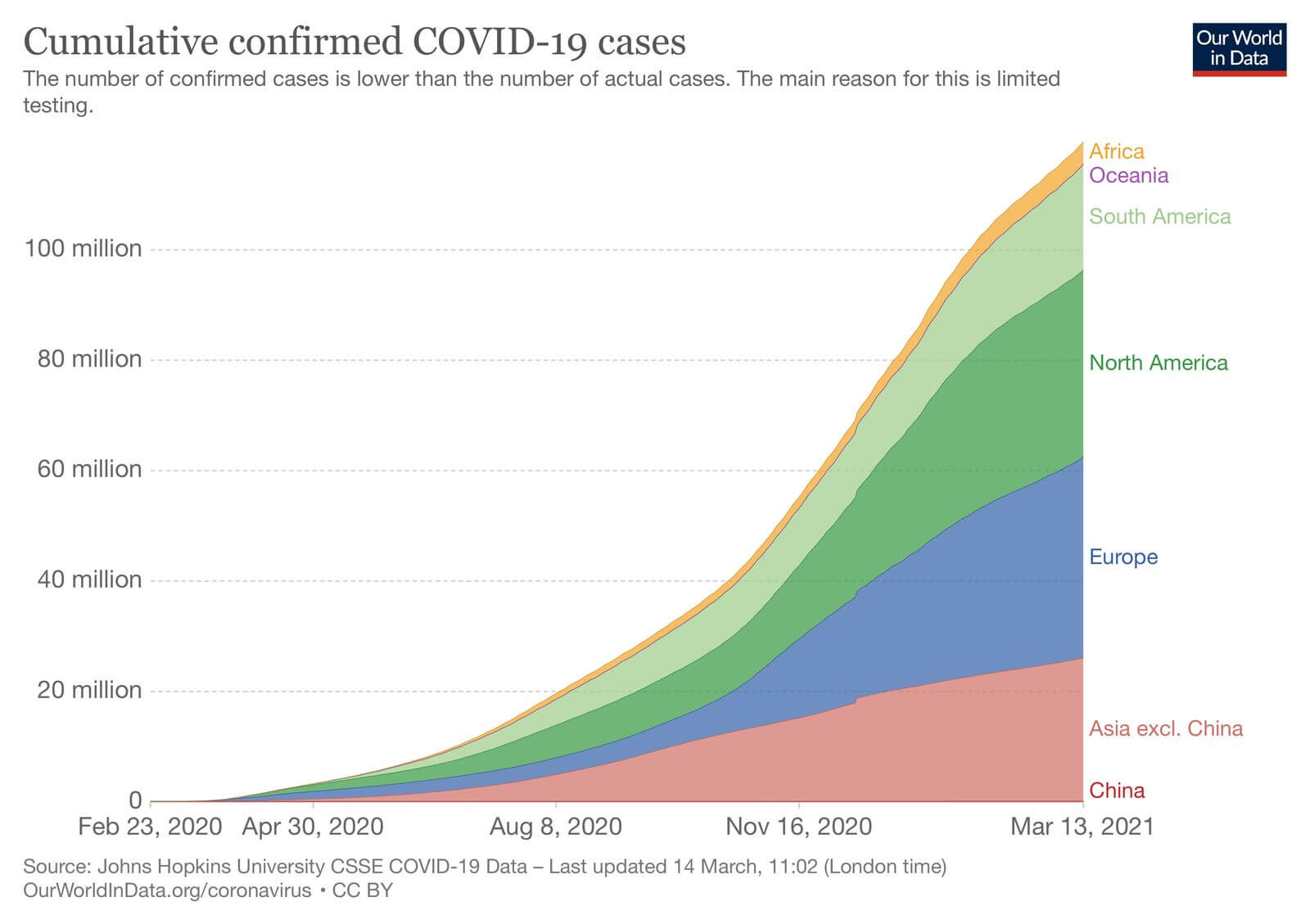 В другий рік боротьби світу із коронавірусною інфекцією, регіон Європи зберігає високу частку виявленості випадків, станом на 13 березня досягнувши 36 млн. випадків серед 119 мільйонів у всьому світі.