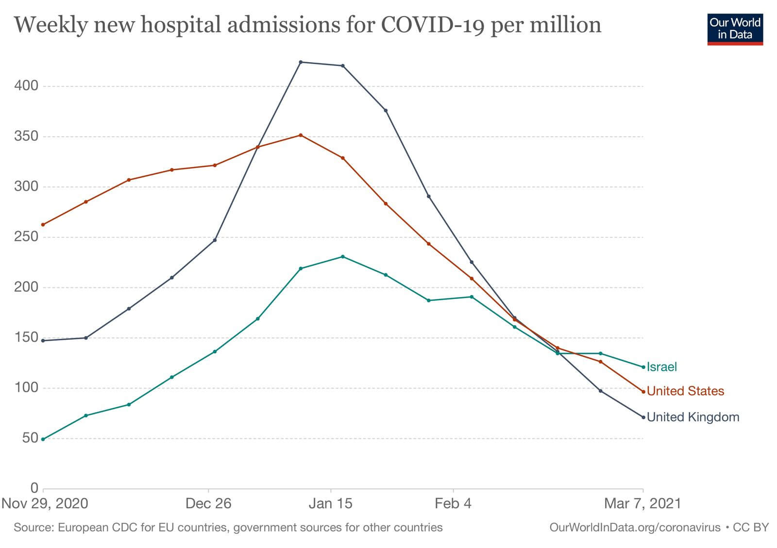 Станом на 13 березня Ізраїль вакцинував хоча б однією дозою уже практично 60%, Великобританія майже 35%, США понад 20% населення. Розпочавши вакцинацію від коронавірусної інфекції одними із першими і одразу ідучи високими темпами, ці країни сьогодні уже показують суттєве зменшення госпіталізації, пов’язаної із коронавірусною інфекцією.