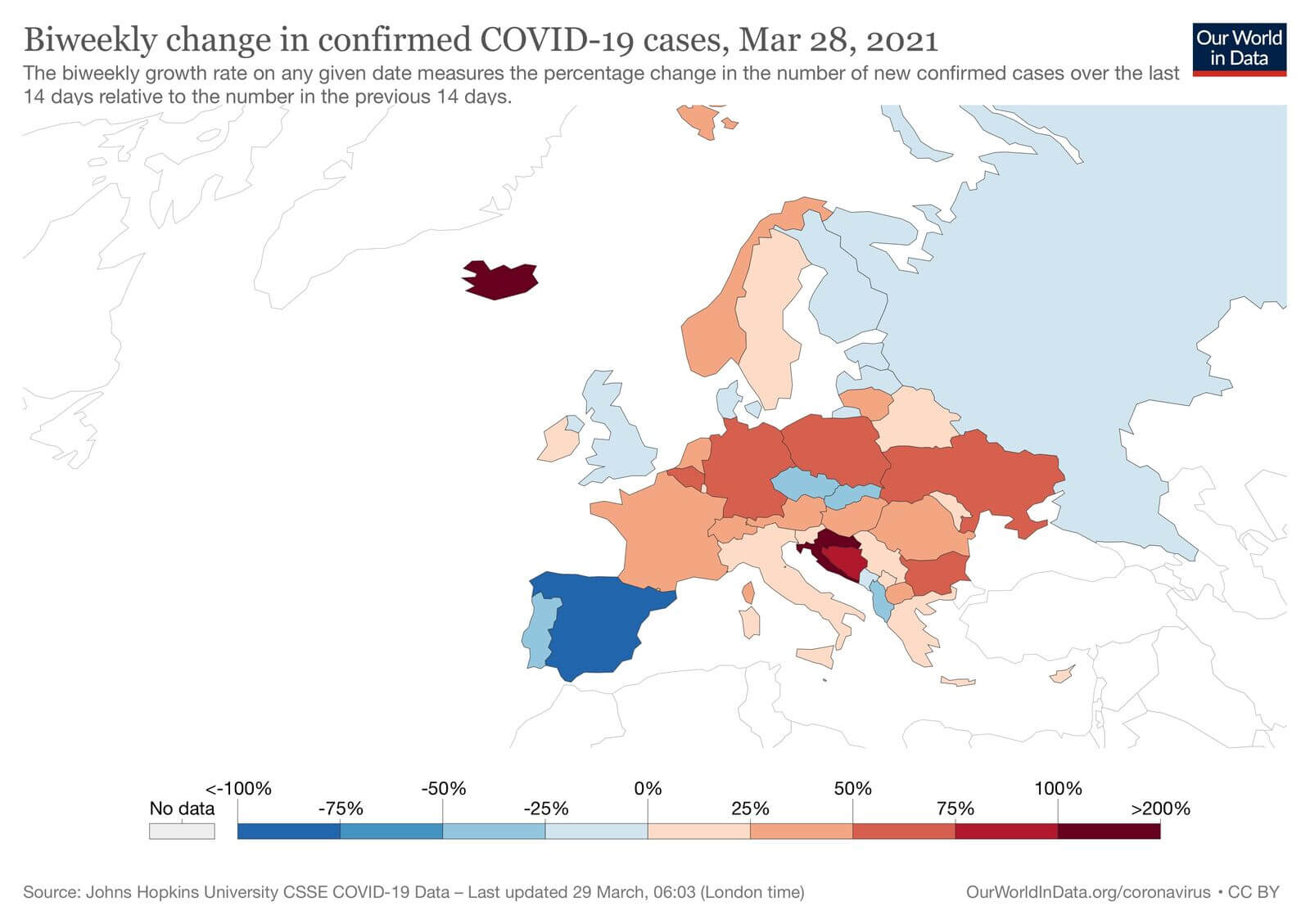 Проте ряд країн почали показувати спади у темпах виявленості, серед них, зокрема, і лідер вакцинації Великобританія, а також і Португалія, Іспанія, Албанія, Чорногорія, Чехія, Словаччина, Данія. Водночас Україна, Польща, Німеччина показують понад 60% росту за останні два тижні, порівнюючи із попередніми.