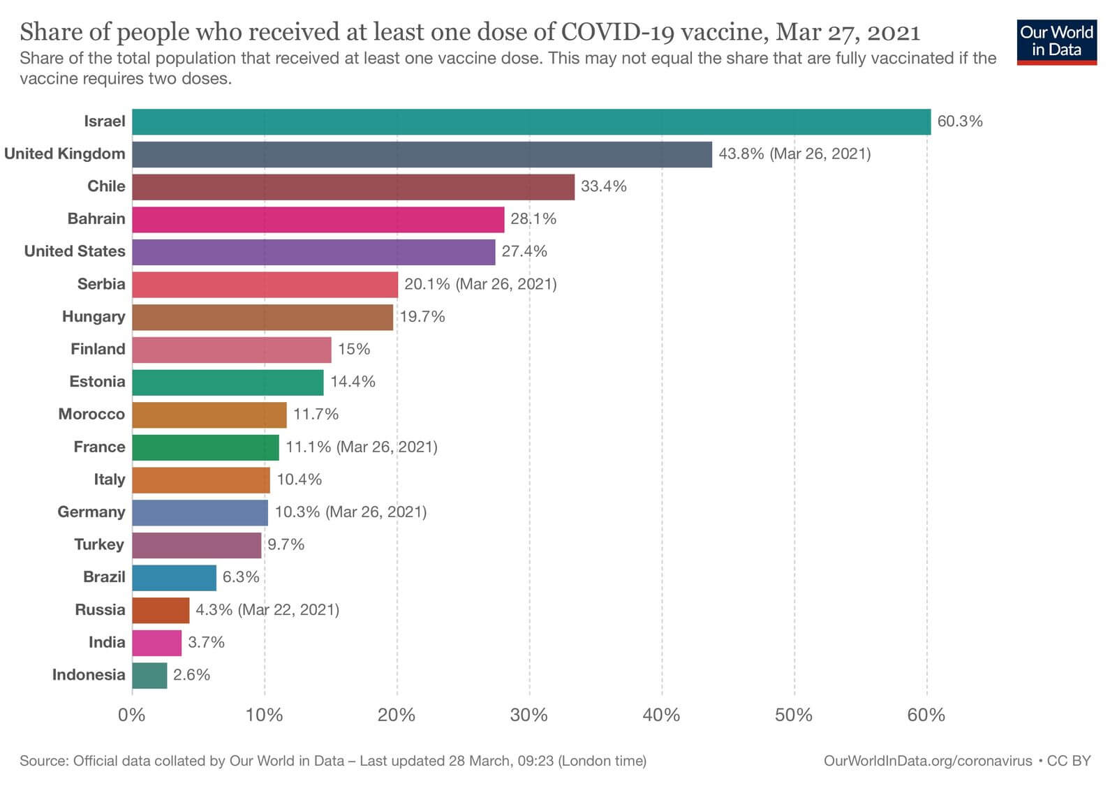 За кількістю населення, охопленого вакцинацією (як мінімум однією дозою), лідером є Ізраїль із 60.3% охопленого населення, Великобританія із 43.8%, Чилі із 33.4%. На шостому місці у світі знаходиться Сербія із 20% охопленого населення. Також уже більше 10% населення провакцинували щонайменше однією дозою Франція, Італія, Німеччина, майже 15% балтійські країни, Фінляндія та Естонія.