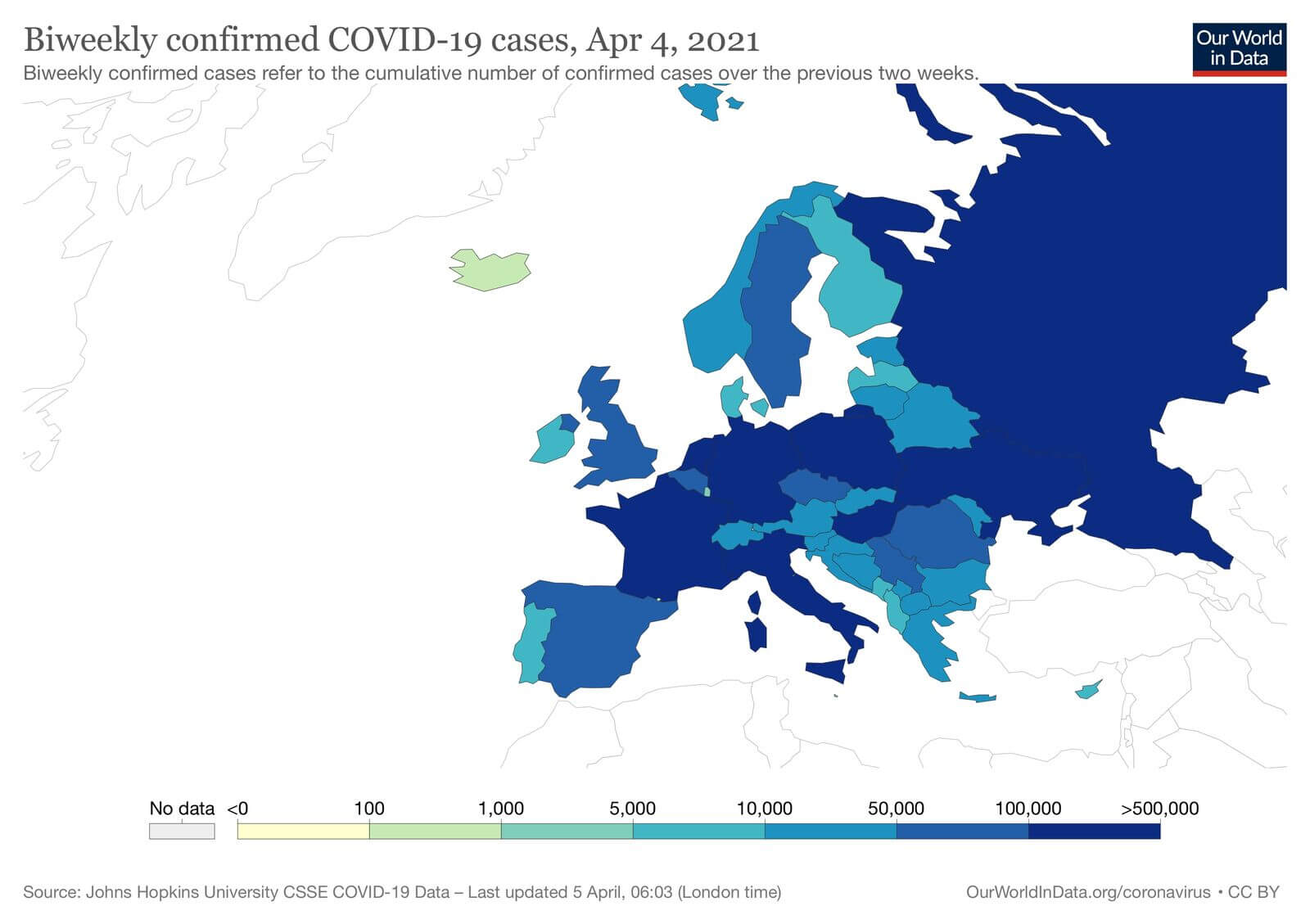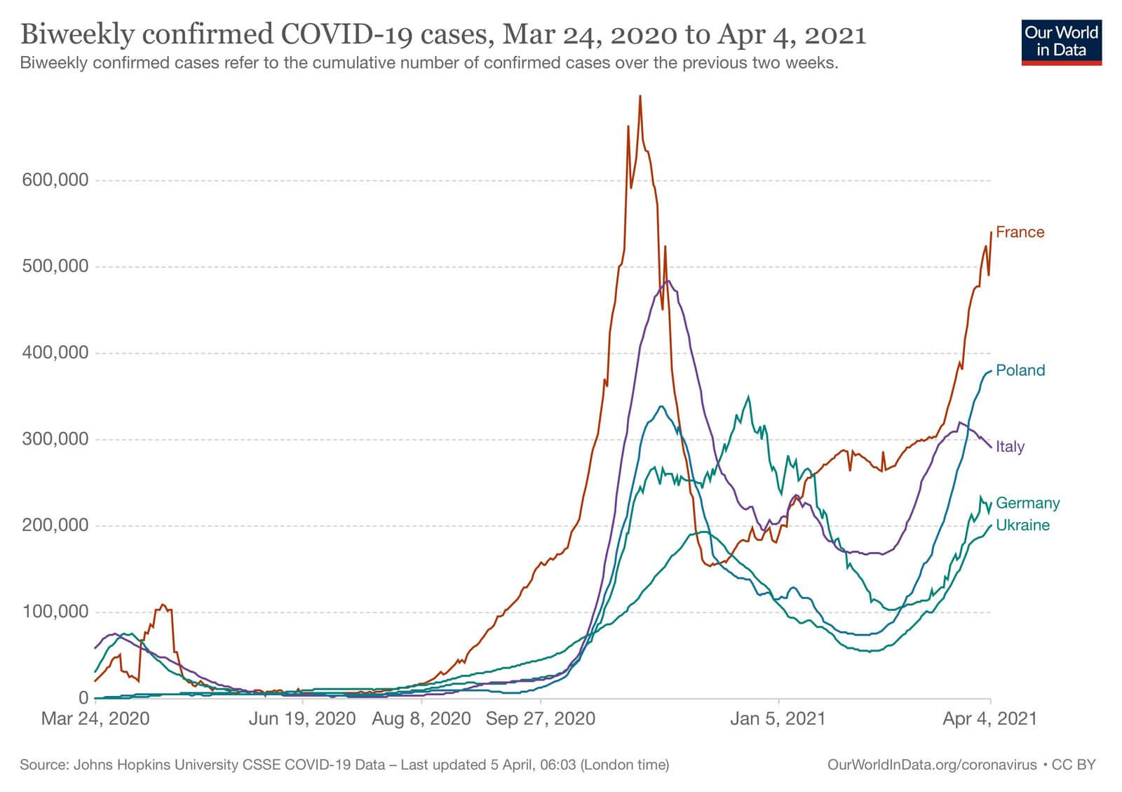 Серед майже 8 мільйонів нових випадків коронавірусної інфекції за останні два тижні у світі, 2,88 мільйона — у Європі (36%). У п’ятірці країн із найбільшою кількістю випадків Франція із 540 тис. випадків, Польща із 379 тис. випадків, Італія із 291 тис. випадків, Німеччина із 226 тис. випадків, Україна із 200 тис. випадків.