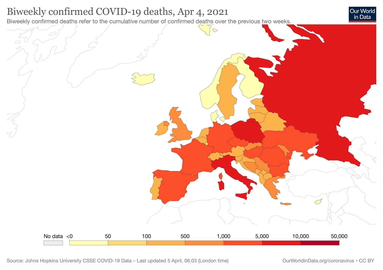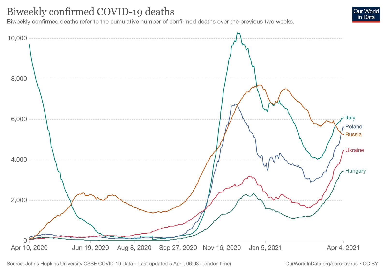 Серед 136 тис. смертельних випадків від коронавірусної інфекції у світі за останні два тижні, 48 тис випадків — у Європі (35%). В розрізі країн, найбільше у Італії — понад 6 тис. смертельних випадків, Польщі — 5,6 тис., Росії — 5,2 тис., Україні — 4,4 тис., Угорщині — 3,4 тис смертельних випадків.