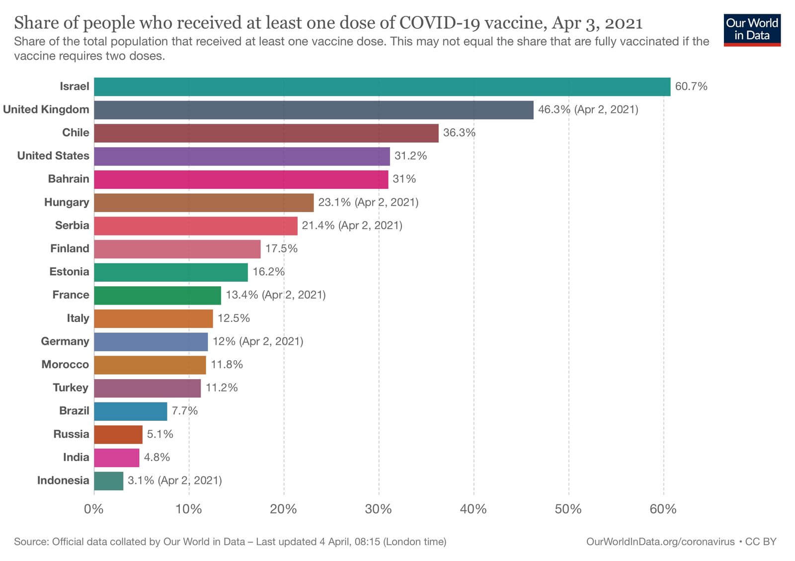 60% населення вакциновано щонайменше однією дозою в Ізраїлі, 46% у Великобританії, понад 30% у Чилі, США та Бахрейні, понад 20% — в Угорщині та Сербії, більше 10% — у Фінляндії, Естонії, Франції, Італія, Німеччині, Марокко, Туреччині.