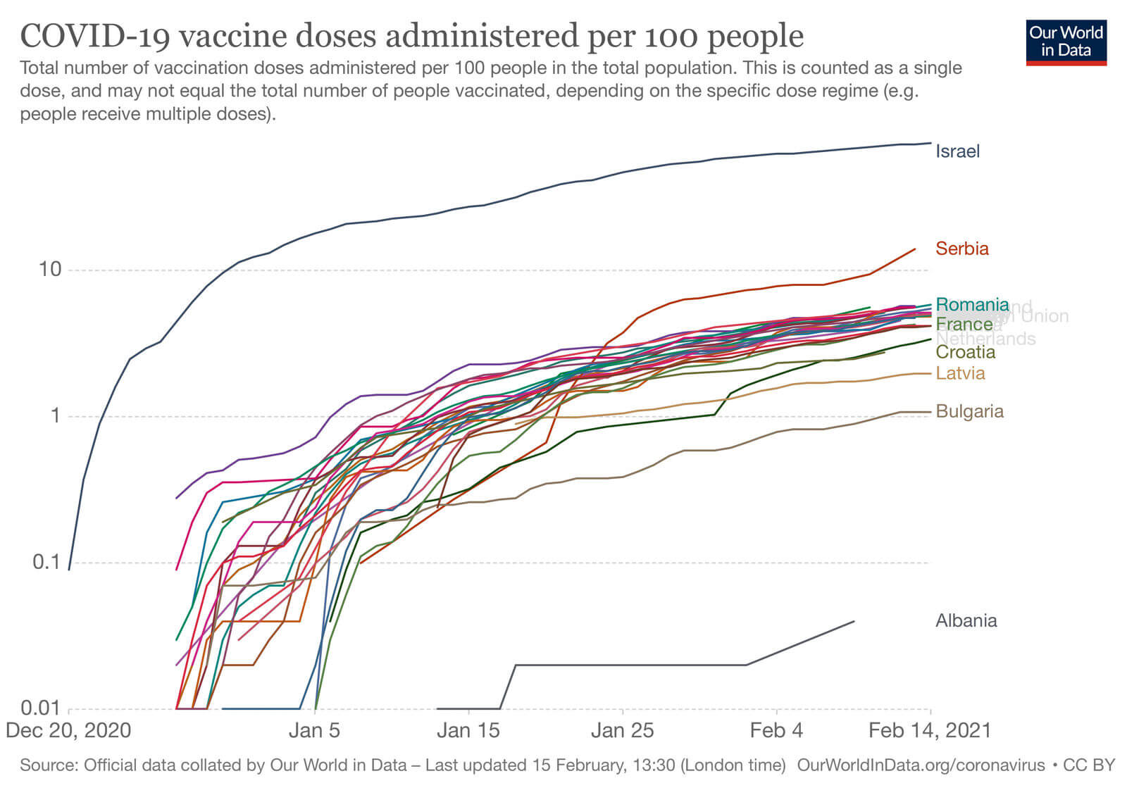 Проте, якщо говорити про охопленість населення країни вакцинацією (з розрахунку введених доз на 100 осіб), то лідером є Гібралтар, Ізраїль, Сейшели, ОАЕ. Причому Ізраїль повністю вакцинував уже 2,53 млн осіб (для порівняння, більше вакцинували лише США — 14,08 млн. осіб, а усі країни ЄС — 7,11 млн осіб).