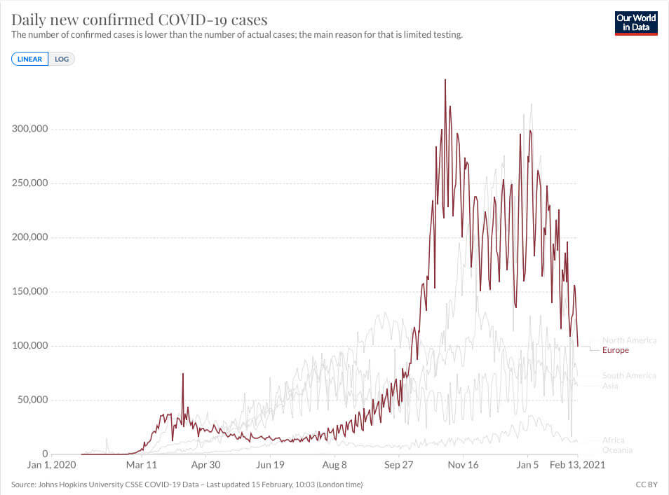 Кількість щоденно виявлених нових випадків коронавірусної інфекції продовжує зменшуватись після піку восени 2020 у всіх регіонах світу, хоча їх значення у Європі залишається найвищим на рівні із Північною Америкою. Проте смертність від коронавірусної інфекції у Європі та інших регіонах залишається високою, практично не показуючи тенденції на спад і перевершуючи дані першої хвилі пандемії навесні 2020 року.