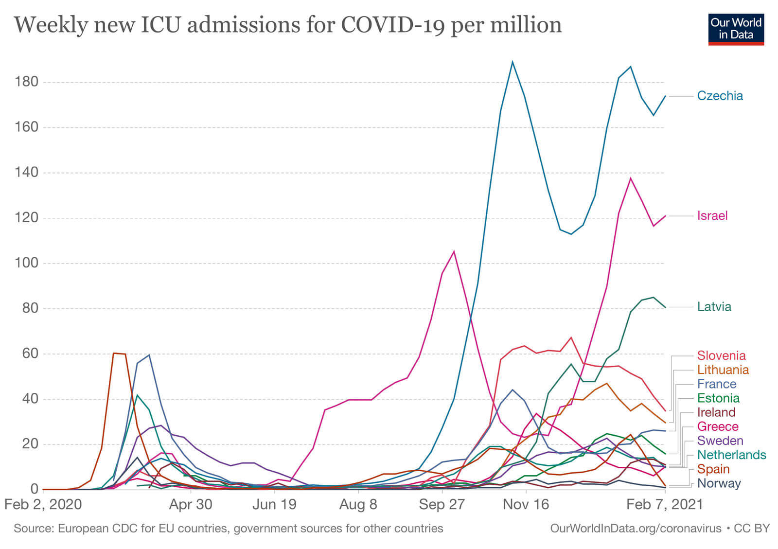 У розрахунку на мільйон населення, у Чехії тижнева кількість осіб, госпіталізованих у відділення інтенсивної терапії, останнім часом перевищує показники першої хвилі навесні 2020 у три рази. Аналогічний стрімкий ріст нових госпіталізацій і у Ізраїлі.