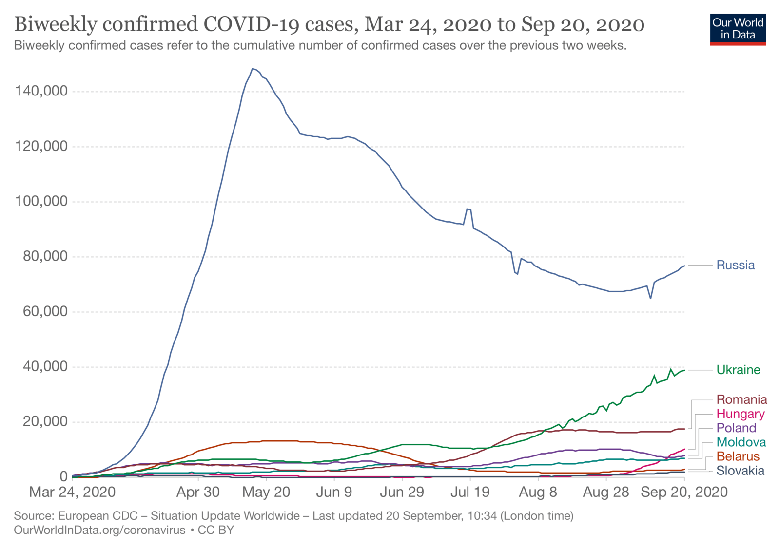 Захворюваність на коронавірус у країнах Європи продовжує набирати темпів і поширюватись. Іспанія та Франція уже сягнули піку, вищого за попередній, Великобританія наближається до другого спалаху. Україна із абсолютним значенням випадків, відзвітованих за останні два тижні, посідає четверте місце в Європі після Франції, Іспанії, Росії.