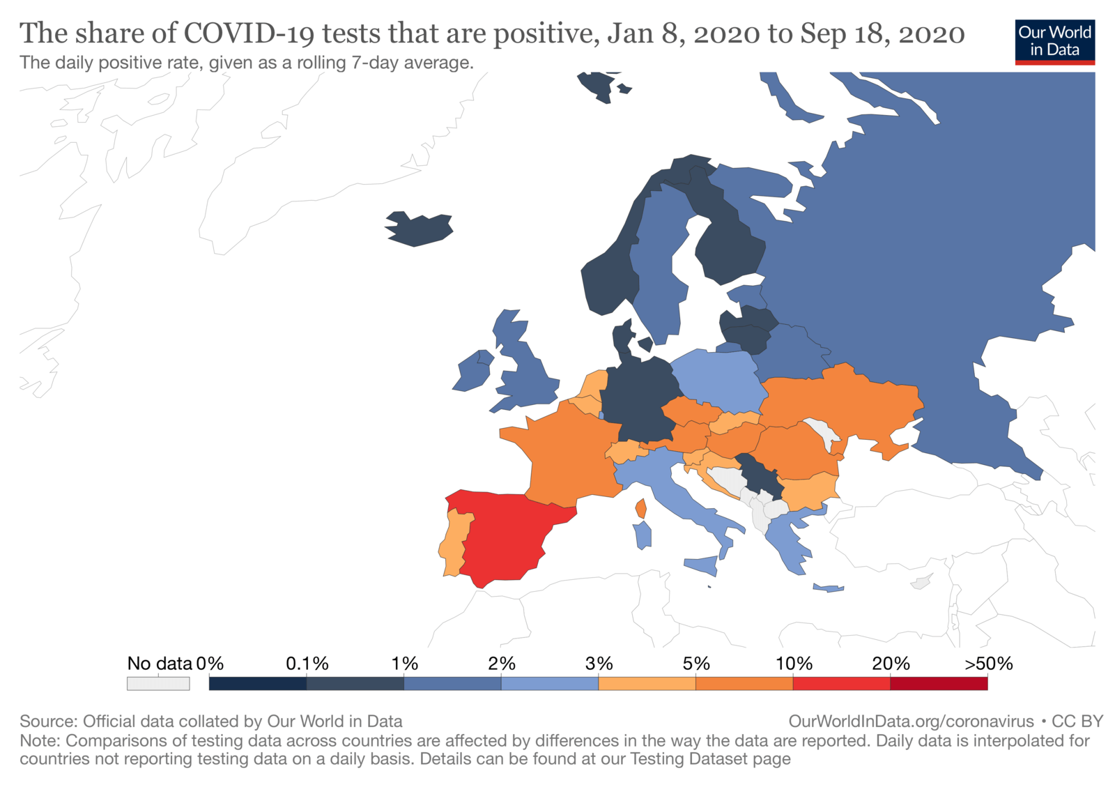 Відсоток позитивних тестів серед усіх проведених в Україні серед усіх країн Європи є найвищим після Іспанії (Іспанія — 11.8%, Україна — 9.7%, до порівняння Франція — 5.4%, Австрія — 5.1%, Великобританія — 1.4%, Німеччина — 0.8%). Джерело: Our World in Data