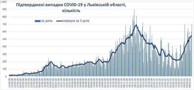 На жаль, показник виявленості випадків коронавірусної інфекції впродовж березня у Львівській області продовжує зростати, наближаючись до пікового рівня у листопаді 2020 року. Так, з 1 березня, коли було виявлено 315 нових випадків коронавірусної інфекції, кількість зросла до 704 12 березня. В середньому ми досягли 545 випадків в день, що вже практично досягло листопадового спалаху, коли у середньому було 550-690 випадків за день.
