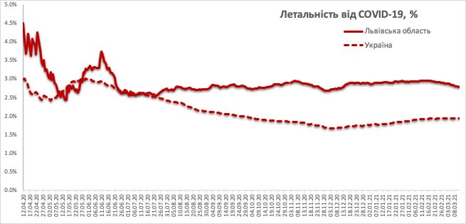Відповідно, зменшення і невисокий рівень відзвітованої смертності від коронавірусу зумовило те, що крива Львівської області має тенденцію до деякого наближення до середньоукраїнського рівня, проте перевищення показників все ще залишається суттєвим.
