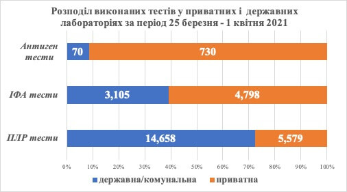 ПЛР та антиген-тести в більшості проводили за останній тиждень у державних лабораторіях (75% усіх ПЛР і 68% усіх антиген-тестів), ІФА тести — в більшості у приватних (65% усіх здійснених за останній тиждень).