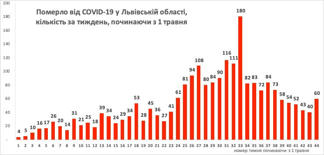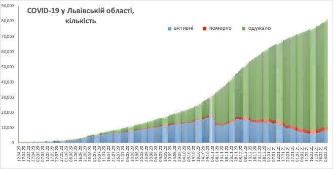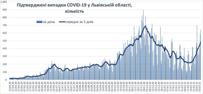 Упродовж першого тижня весни у Львівській області погіршилась епідеміологічна ситуація із коронавірусною інфекцію. Кількість смертей зросла до 60 осіб, таким чином перевищивши тижневі кількості відзвітованих смертельних випадків з кінця січня 2021 року.