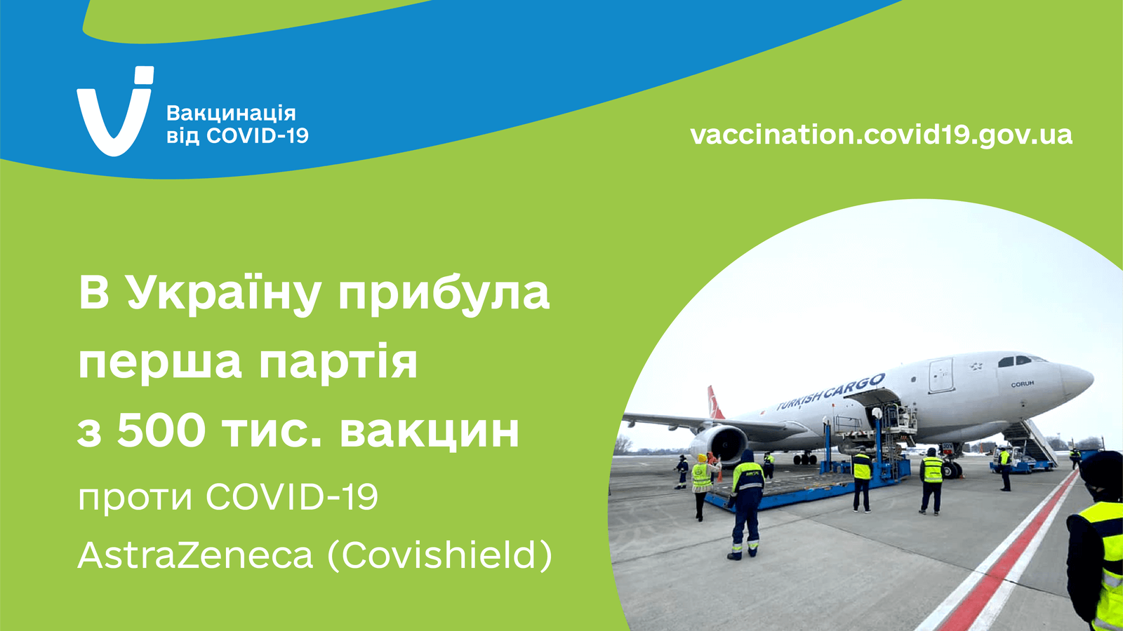 23 лютого 2021 року, в Україну з Індії прибула перша партія з 500 тис. доз вакцини проти COVID-19 AstraZeneca (Covishield). Тепер вакцину розмитнять, розподілять між регіонами, і незабаром в країні розпочнеться вакцинація.