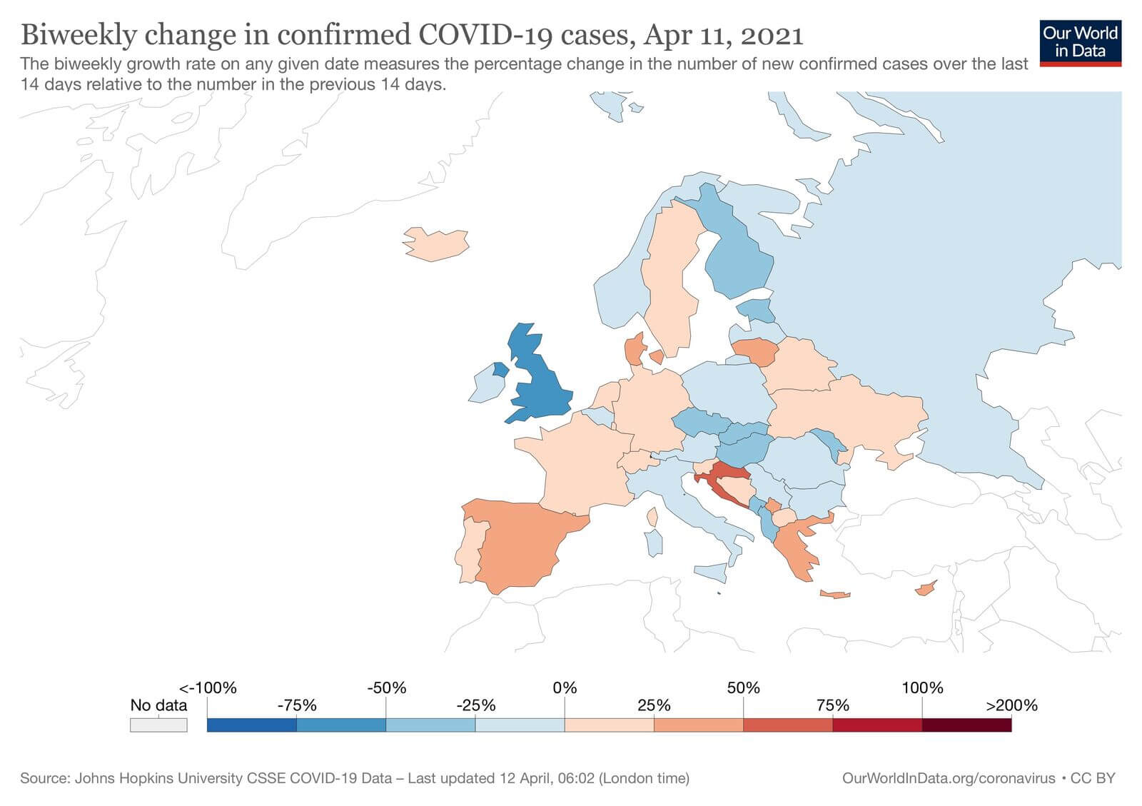За останні два тижні країни Європи поділились на ті, які відзвітували про ріст виявленості випадків: Хорватія, Іспанія, Греція, Литва, Данія (більше 25% росту) та про зменшення виявленості випадків: Великобританія (50% спаду), Фінляндія, Естонія, Чехія, Словаччина, Угорщина, Молдова, Албанія, Чорногорія (25-50% спаду). Україна станом на 11 квітня показує 14% росту виявленості випадків.