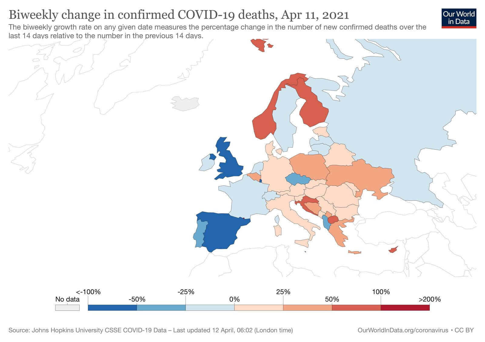 Смертність зросла у Норвегії, Фінляндії, Хорватії, Македонії більше ніж на 50%. Україна і Польща теж показують ріст смертності орієнтовно 38%. Проте вже є ряд країн, що показують спад смертності, найбільше це помітно у Іспанії і Великобританії — більше 50%.