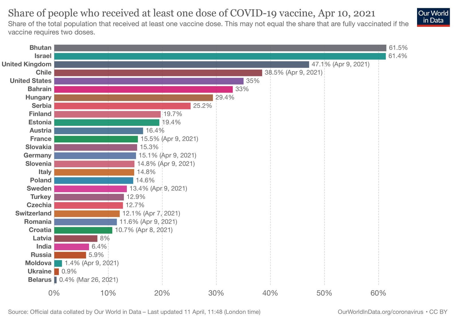 Уже 773,5 мільйона доз вакцин введено у світі, з них 350 мільйонів у Азії, 205 мільйонів у Північній Америці, 153 мільйони у Європі. Більше 30% населення провакциновано щонайменше однією дозою у Бутані, Ізраїлі (понад 60% населення), Великобританії (47%), Чилі (38%). Серед країн Європи найбільше охопили своє населення вакцинацією Угорщина — практично 30%, Сербія — більше 25% населення. Україна станом на 10 квітня охопила лише 0,9% свого населення.