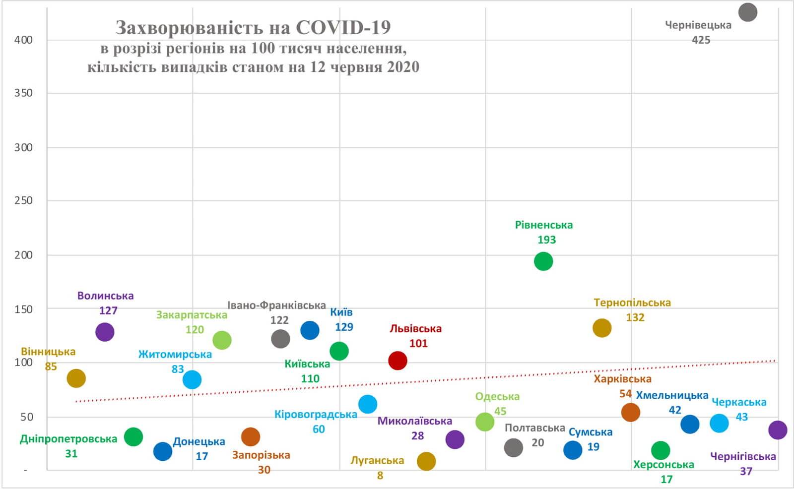 Захворюваність на COVID-19 в розрізі регіонів на 100 тисяч населення станом на 12 червня.