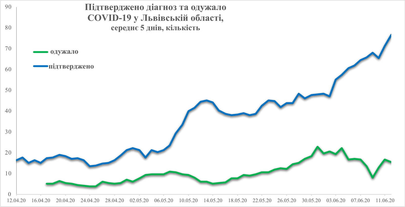 Підтверджено діагноз та одужало від COVID-19 у Львівській області станом на 12 червня, середнє за 5 днів.