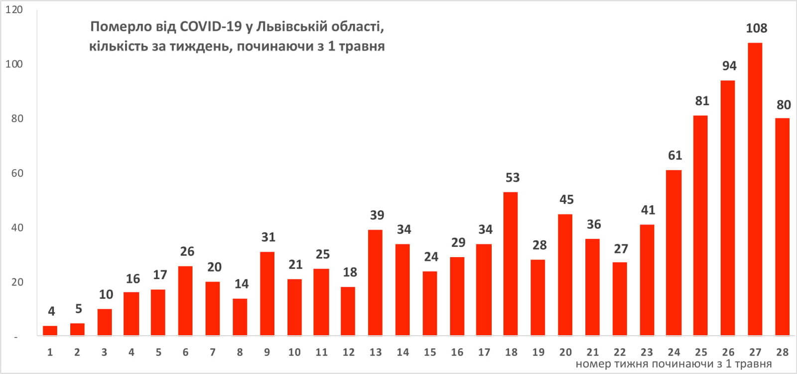 Смертність в області залишається вищою за середньоукраїнську, проте кількість померлих від COVID-19 цього тижня дещо нижча за попередні тижні.