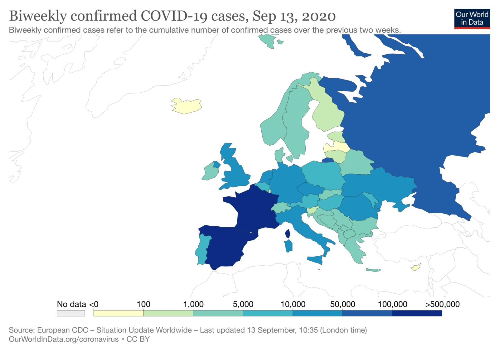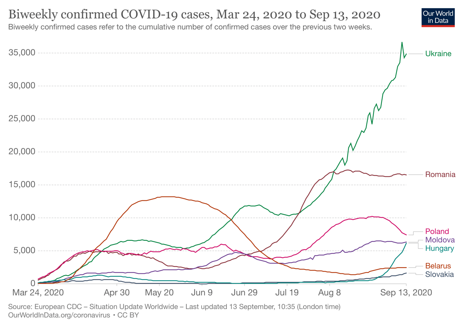Двотижневий аналіз кількості виявлених випадків. Як бачимо, кількість випадків в Україні найбільший після Іспанії, Франції і Росії; серед західних сусідів у нас практично найвище зростання кількості випадків.