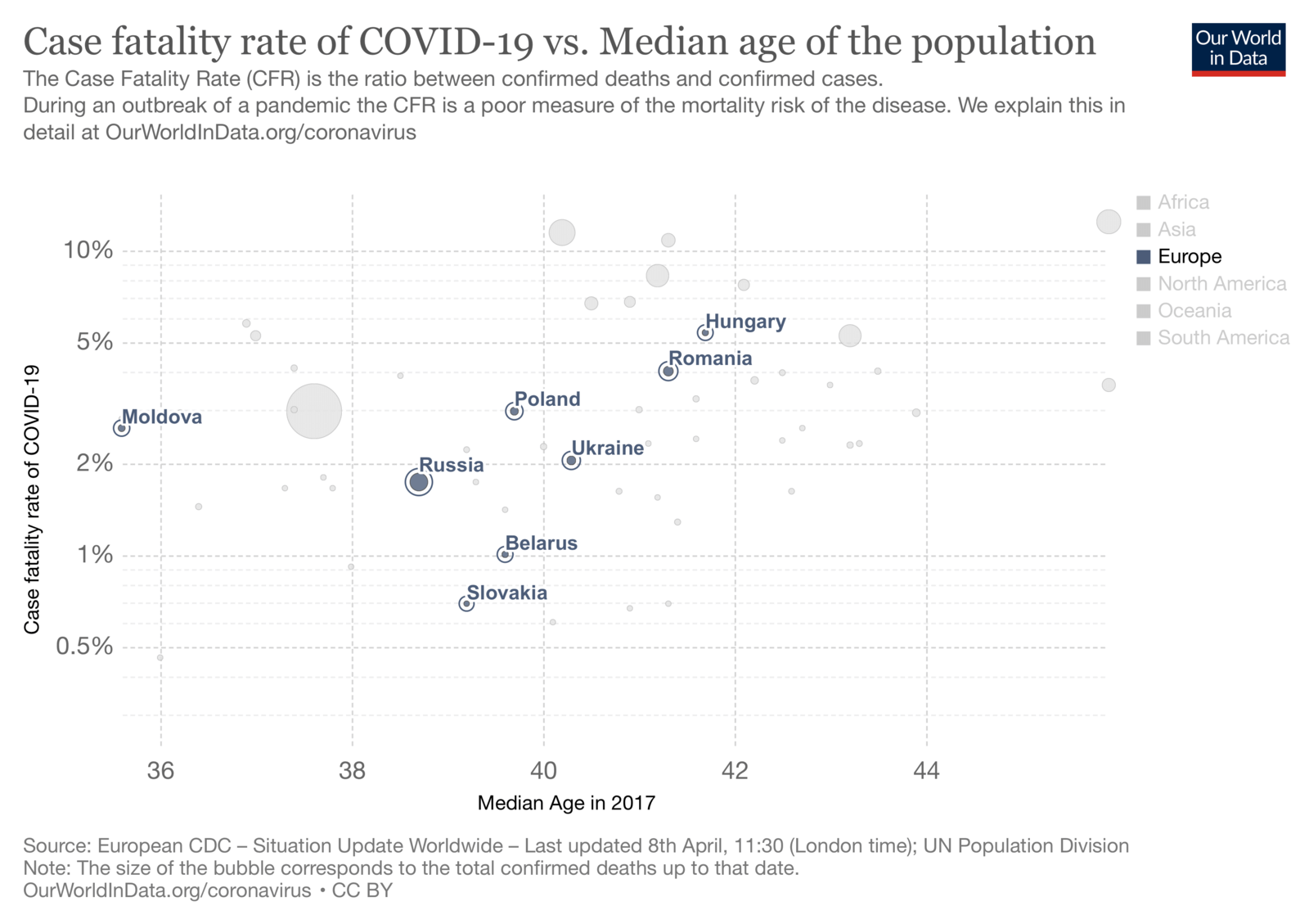 Порівняння смертності і середнього віку населення. Як бачимо, найвищий рівень смертності серед наших сусідів в Угорщині, як і середній вік населення. Найменша смертність у Словаччині, найменший середній вік населення серед наших сусідів у Молдові, проте смертність не суттєво вища за показник в Україні. Україна має летальність 2.04% і середній вік населення 40.3. Джерело: Our world in data