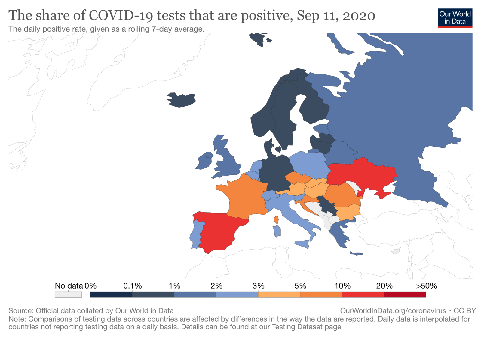 Погіршилась ситуація у порівнянні із даними, які ми публікували минулого тижня, в тому числі щодо відсотка позитивних тестувань. Минулого тижня Україна була оранжевого кольору на карті, знаходячись між 5 і10% позитивних випадків, цього разу ми на рівні Іспанії (де, нагадуємо, спостерігається спалах, вищий за пік епідемії навесні) і, відповідно, відсоток позитивних тестів цього тижня позиціонував Україну між 10 і 20%.