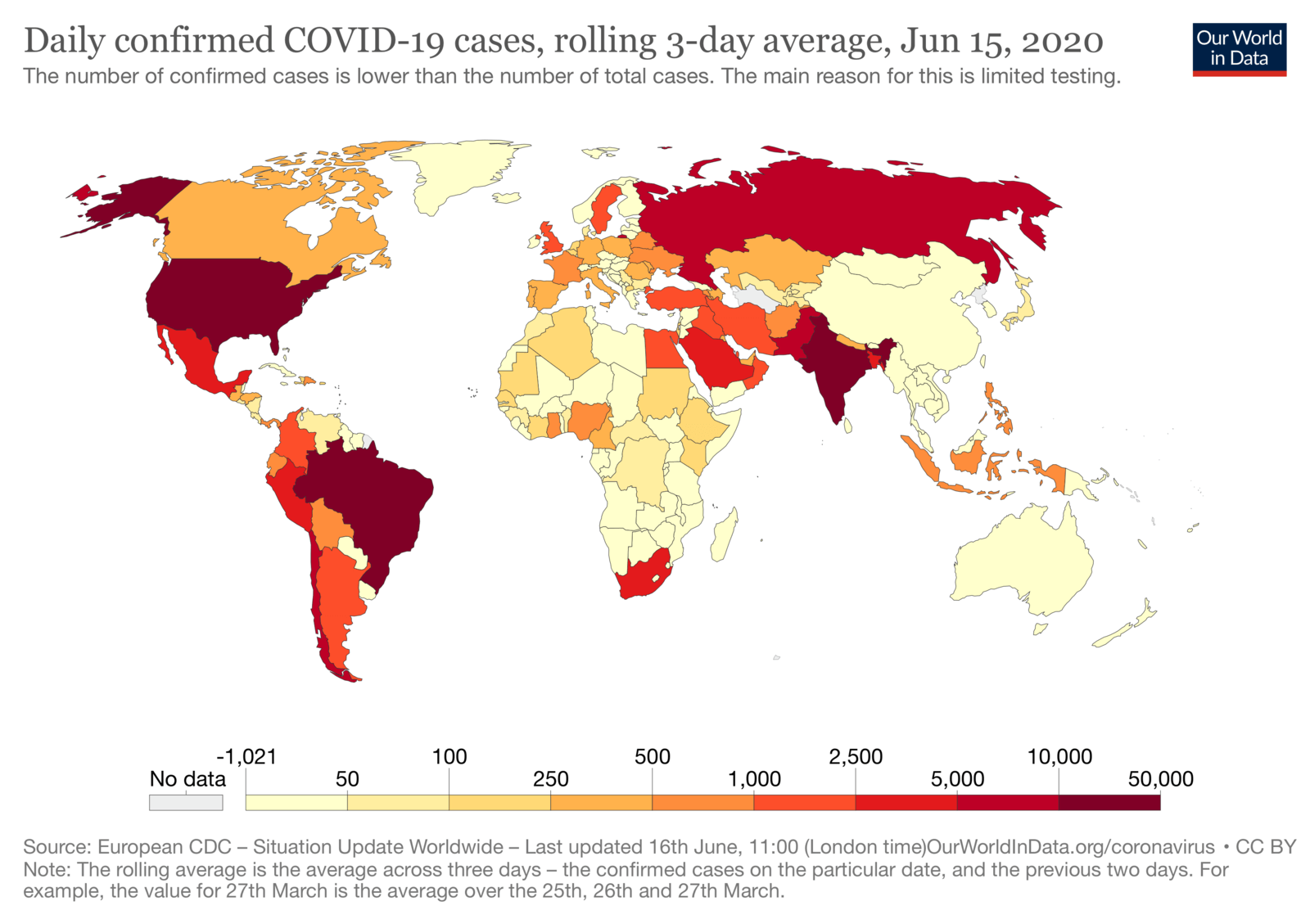 На карті, яка демонструє кількість підтверджених випадків за день (в розрахунку на мільйон населення), видно, що ступінь ураження України на даний момент є навіть вищим за Італію, Іспанію.