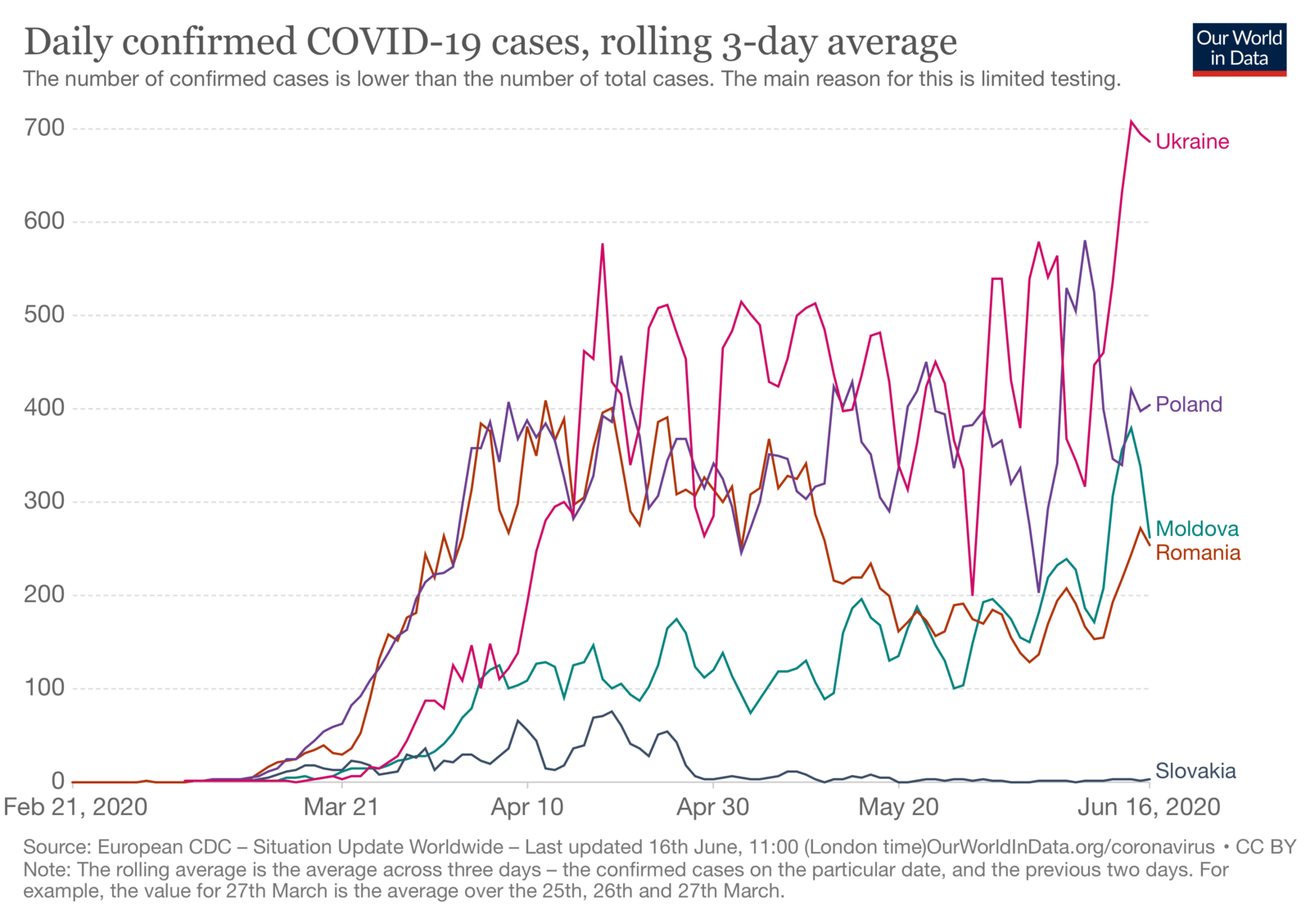 Аналіз ситуації щодо COVID-19 в Україні в порівнянні з сусідніми країнами. Зокрема, наведено середні показники приросту підтверджених випадків за 3 дні (3-денне середнє ковзне) на фоні країн станом на 16 червня 2020 року.