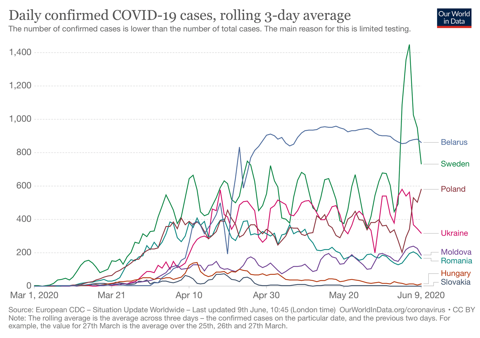 Підтверджені випадки COVID-19 в Україні (середнє за 3 дні) в порівнянні з іншими країнами станом на 9 червня 2020 року.