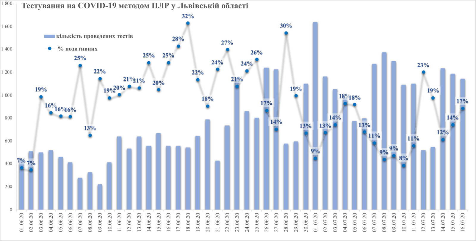 Кількість тестувань у липні, у порівнянні із червнем, зросла. Відсоток позитивних результатів залишається високим, тоді як згідно останніх рекомендацій ВООЗ він мав би бути меншим за 5%.