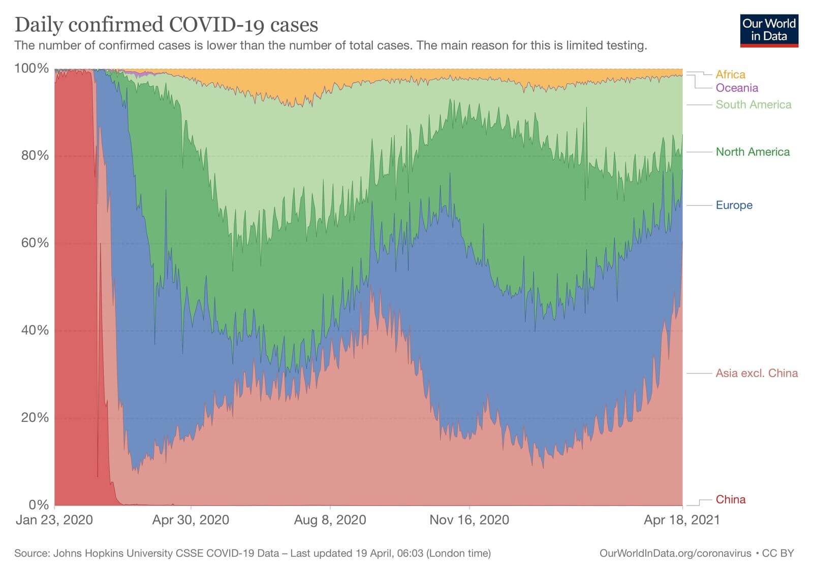 Щоденна кількість виявлених випадків стрімко зросла у регіоні Азії, сягнувши 60% усіх випадків у світі станом на 18 квітня 2021 року, На Європу, відповідно, припадає лише 16% усіх денних випадків, наступним є регіон Південної Америки — 13%. Серед країн Азії, які звітують про найбільшу кількість виявлених випадків за останні два тижні, Індія — 2,5 млн. випадків, Туреччина — 781 тис. випадків, Іран — 305 тис. випадків.
