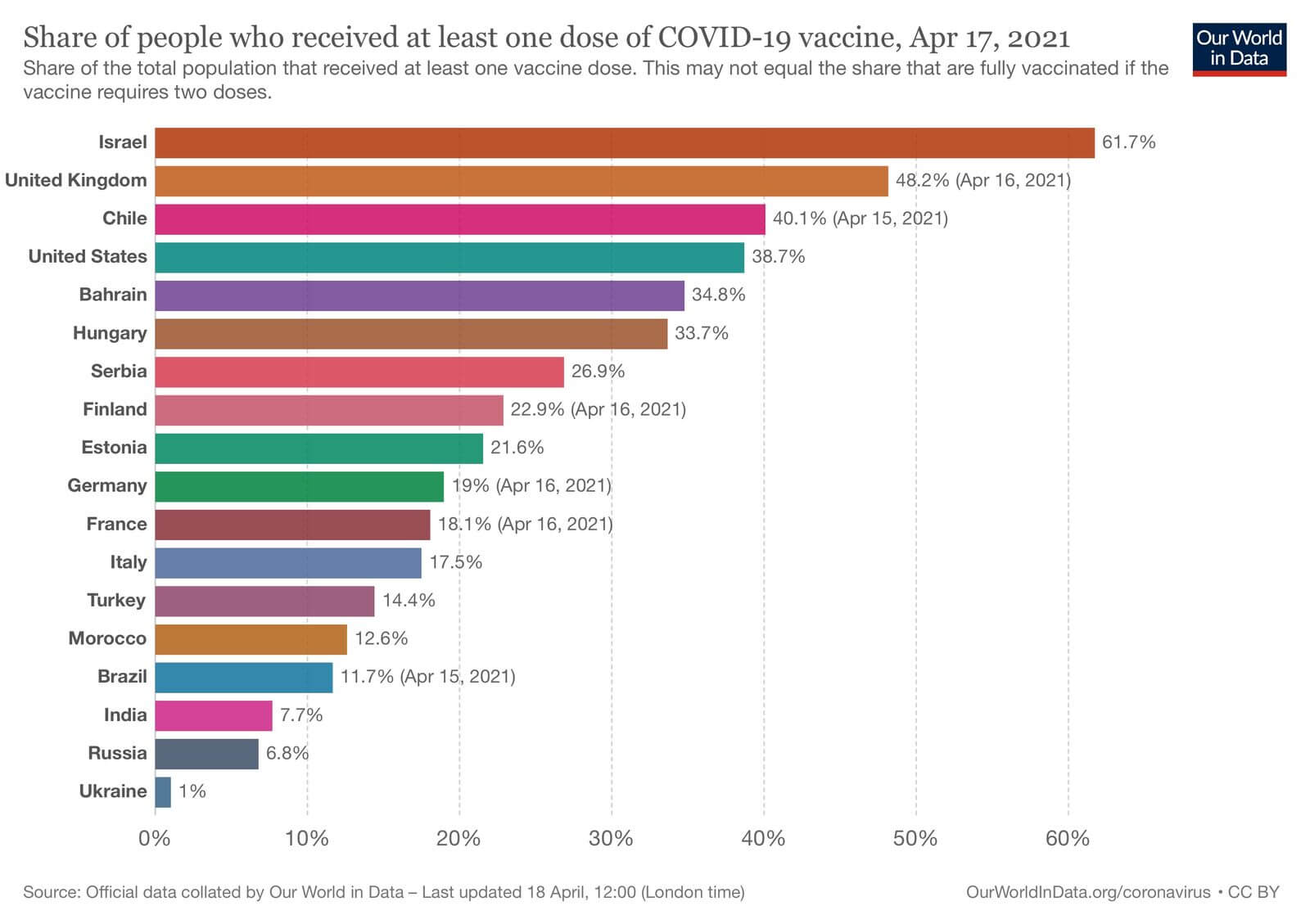 Всього у світі вже введено 890 мільйонів доз вакцини, щонайменше одну дозу вакцини отримали 494 мільйона осіб у всьому світі. Ізраїль і Великобританія уже половину чи більше половини свого населення вакцинували щонайменше однією дозою. Серед інших Європейських країн найбільша частка населення, охопленого щонайменше однією дозою, Угорщина — 33%, Сербія — 27%, Фінляндія — 23%. В Україні лише 1% населення охоплено щонайменше однією дозою.