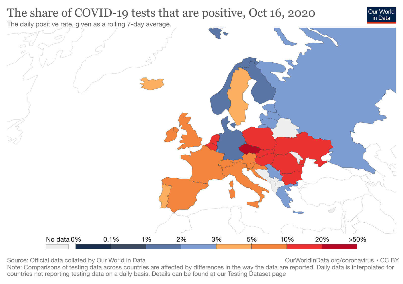 Зростає також відсоток позитивних тестів, який сигналізує про необхідність збільшувати рівень тестувань. За останній тиждень найвище значення у Чехії — 23,4%, далі — Україна 17.6 %, Нідерланди 17,3%, Польща і Словаччина 12,9%, Румунія і Болгарія 12,7%, Бельгія 12,3%, Угорщина 11,5%.