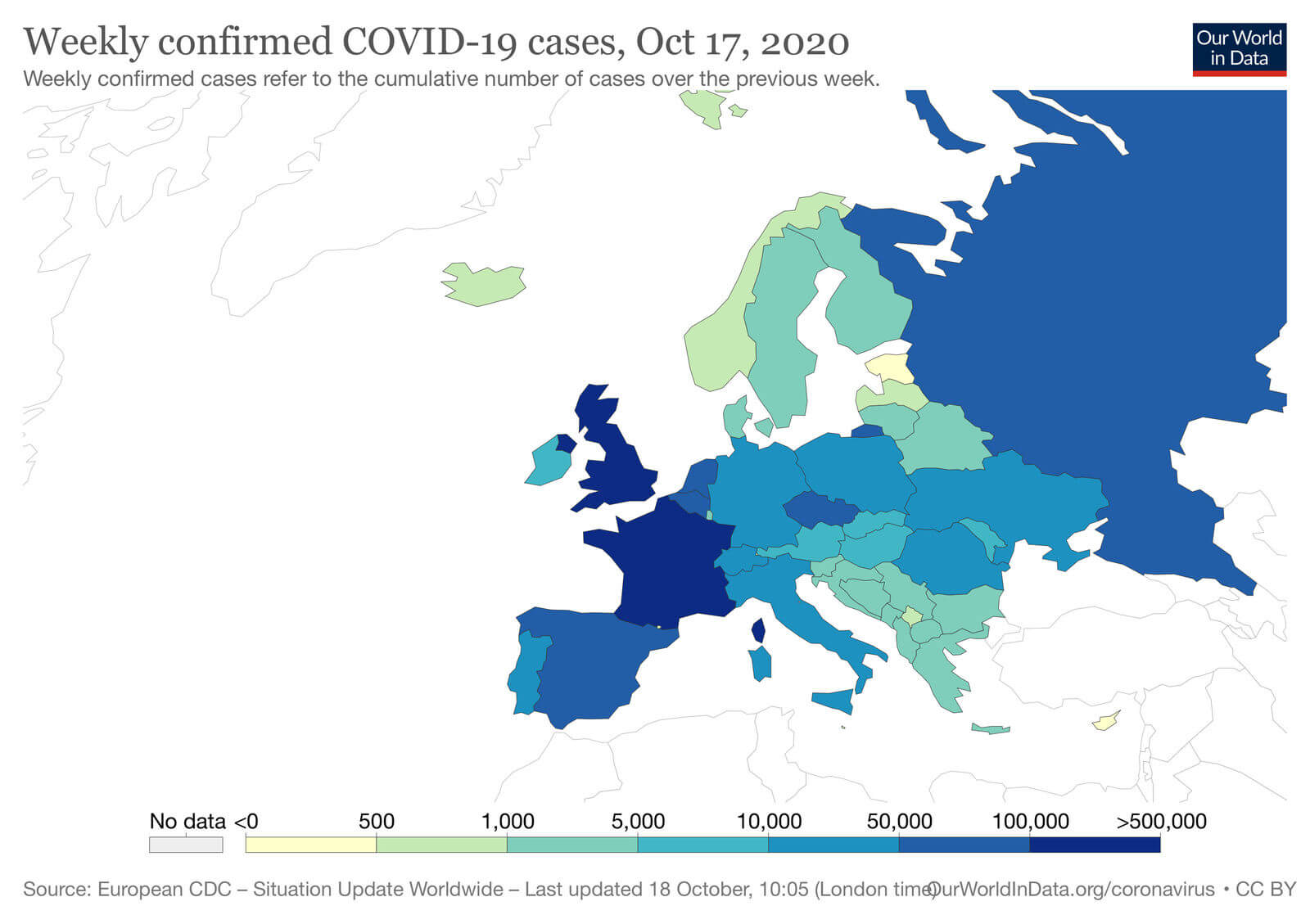 В Європі продовжує наростати кількість випадків виявленої коронавірусної інфекції. Найбільше нових випадків за останній тиждень виявлено у Франції (143 тис) та Великобританії (114 тис). Далі за кількістю випадків йде Росія (97 тис.) та Іспанія (75 тис), а також країни, у яких додалось приблизно 50 тисяч випадків впродовж останнього тижня: Бельгія, Нідерланди, Чехія. В Україні за останній тиждень виявлено 42,5 тисяч нових випадків (минулого тижня — 34,5 тис).