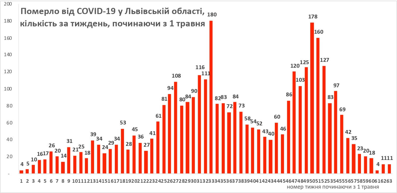 Суттєво зменшилась і кількість смертельних випадків. Так, за останні два тижні було зафіксовано 11 випадків за тиждень, що менше у 16 раз від пікових значень, які складали 180 випадків за тиждень.