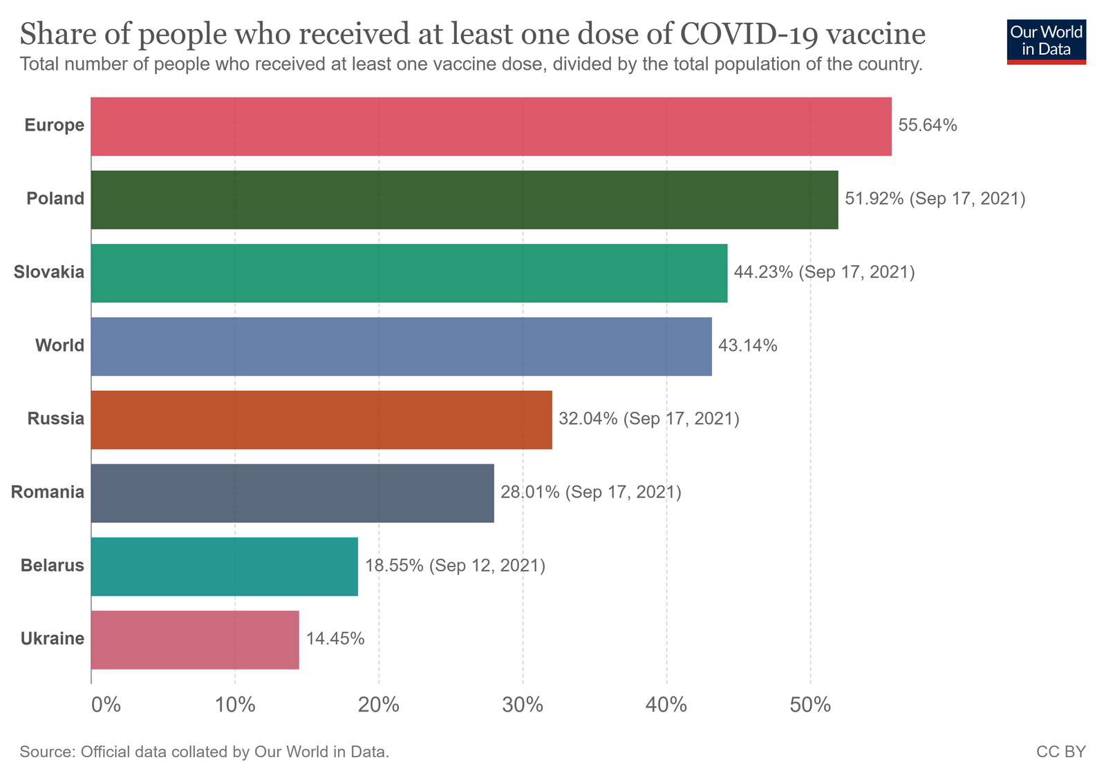5,92 мільярди вакцини було проадмінстровано у світі, 3,4 мільярда осіб (або ж 43% всього населення) вакциновано щонайменше однією дозою і 2,47 млрд осіб — повністю вакциновані. Окрім Африки, в усіх регіонах уже більше 50% населення отримали щонайменше одну дозу. Україна станом на сьогодні охопила щонайменше однією дозою 14,4% населення.