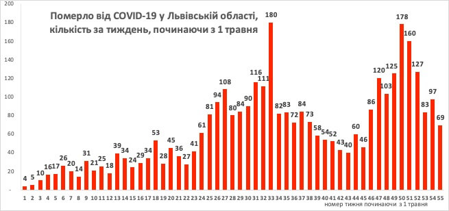 Зменшується також і кількість смертельних випадків коронавірусної інфекції, яка за останній тиждень склала 69 осіб, і це вже третій тиждень поспіль коли тижнева кількість померлих менша за сто осіб.