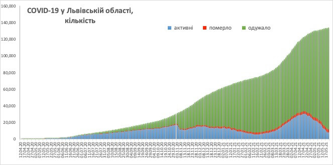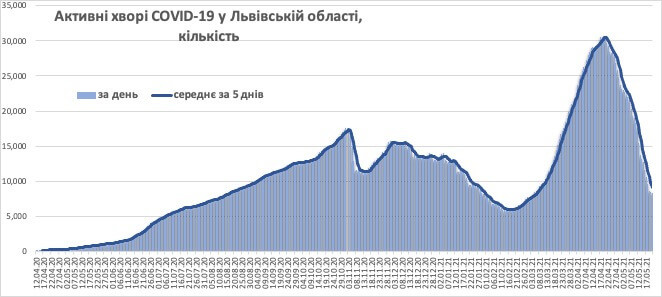 Станом на 21 травня 2021 року кількість активно хворих осіб зменшилась до рівня літнього періоду минулого року і склала 8 381 осіб. Нагадаємо, що під час нещодавнього піку кількість активно хворих сягала понад 30 тисяч осіб, майже у 4 рази більше.