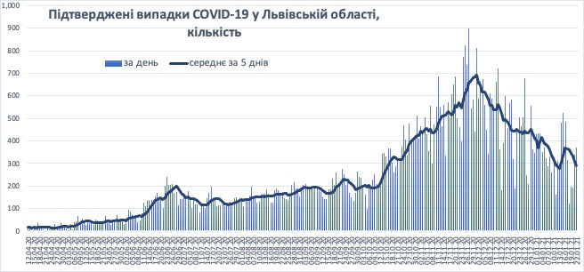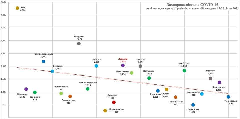 За останній тиждень 15-22 січня у Львівській області було підтверджено 2 021 випадок коронавірусної інфекції. Майже у два рази більше випадків виявлено у м. Києві (4 260) та у двох областях — Запорізькій (2 874) та Дніпропетровській (2 182).