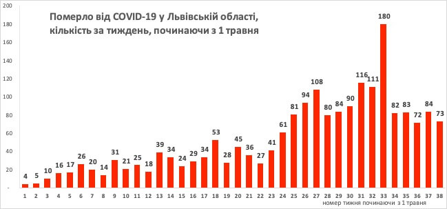 Смертність у Львівській області залишається вищою за середньоукраїнську, проте в кількісному вимірі останні п’ять тижнів кількість підтверджених смертельних випадків від коронавірусної інфекції не перевищує 85 осіб за тиждень.