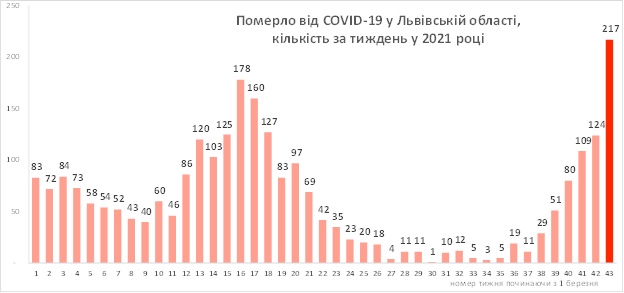 Рекордна кількість хворих на коронавірусну інфекцію померли у Львівські області за останній тиждень — 217 осіб, це на понад 20% більше за найвище пікове значення при весняному спалаху (тоді найбільше за тиждень з 10 по 16 квітня померло 178 осіб).