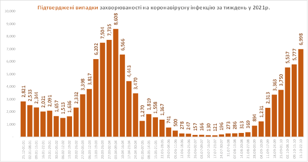 Сумарні тижневі значення теж відображають надзвичайно стрімкий ріст: так, за останній тиждень було підтверджено майже 7 тисяч осіб, які захворіли на коронавірусну інфекцію.