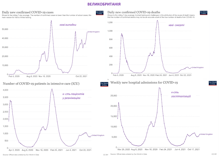 Водночас епідемія поширюється і у інших країнах. До прикладу, у Великобританії зараз також спостерігається зростання поширеності захворюваності, денні випадки сягають 50 тисяч, що практично досягає значення попереднього піку. Проте, як можна побачити із інфографіки, при зростанні виявленості коронавірусної інфекції, кількість смертей від неї, кількість пацієнтів у реанімації і госпіталізації до лікарень зменшується.