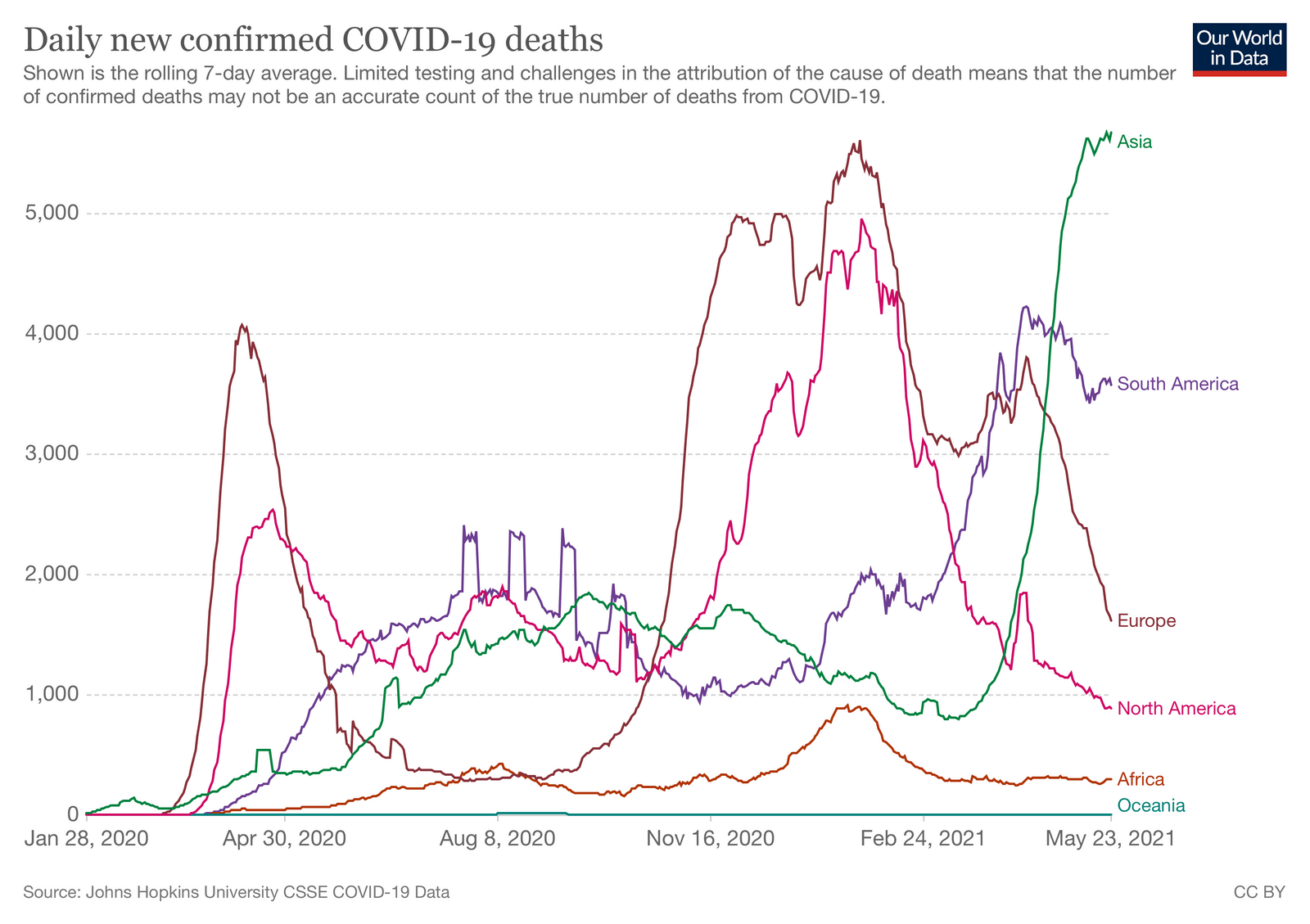 Дещо інша ситуація зі смертністю, крива якої зазвичай іде на спад повільніше, ніж крива виявлених випадків. Так, суттєву тенденцію до спаду показує крива смертності від коронавірусної інфекції у Європі, Північній Америці, стабільність спостерігається у регіоні Африки. Найвищою залишається щоденна фіксація смертельних випадків у Південній Америці та Азії. Серед країн Європи ріст смертельних випадків від коронавірусної інфекції впродовж останніх двох тижнів в порівняні із попередніми двома зафіксовано у Латвії та Росії.