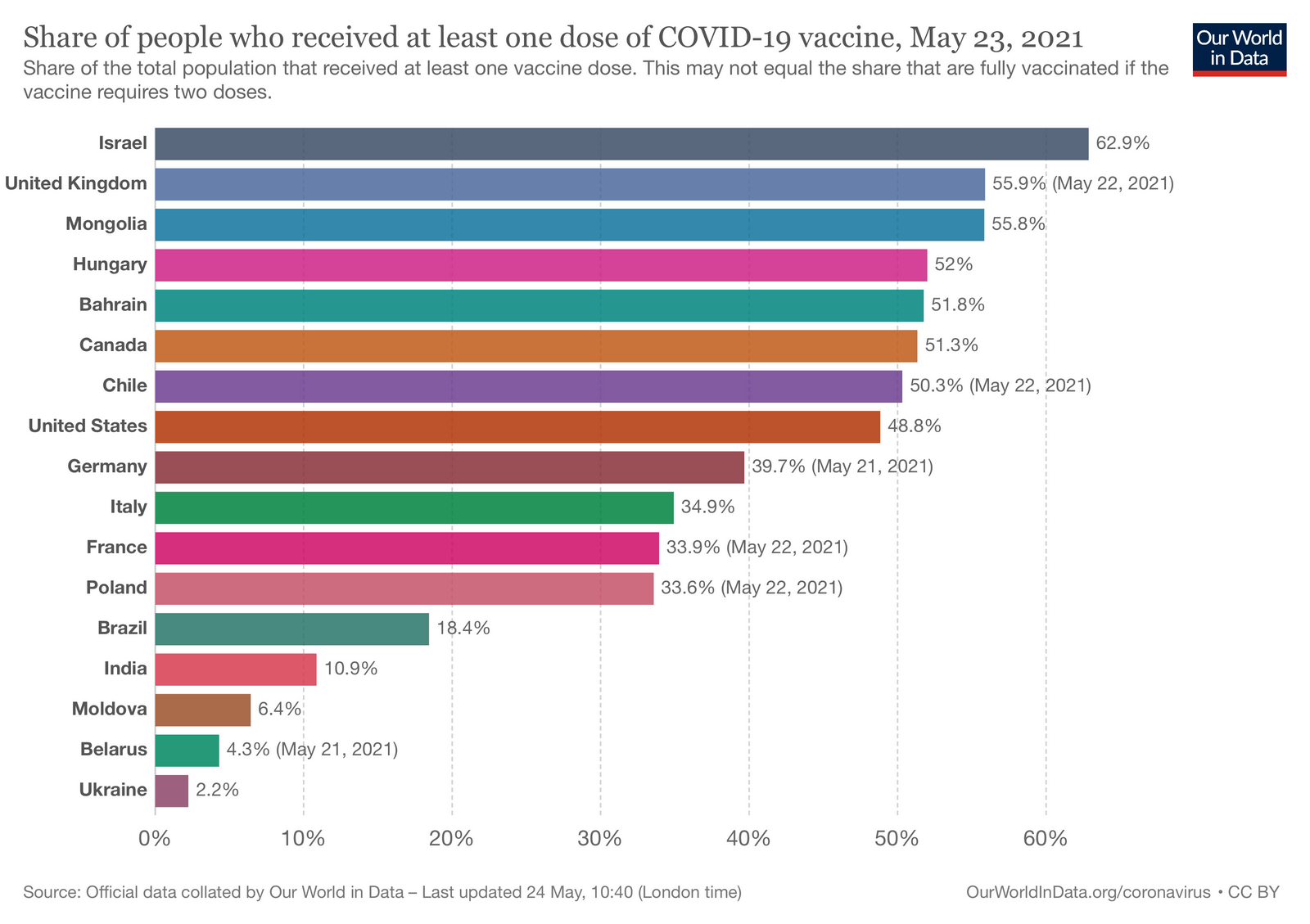 1,67 мільярди доз вакцини від коронавірусної інфекції введено у світі, 763 мільйони осіб отримали щонайменше одну дозу і 390 мільйонів осіб повністю провакцинувались. До країн, які провакцинували більше 50% свого населення хоча б однією дозою, додалась серед європейських країн Угорщина, а також Канада. Польща, Італія, Німеччина, Франція уже вакцинували понад 30% населення хоча б однією дозою. Україна станом на 23 березня вакцинувала 2.2%, Білорусь 4.3%, Молдова 6.4% населення хоча б однією дозою.