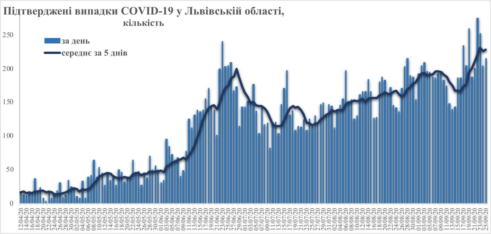 Цей тиждень, на жаль, приніс нові негативні рекорди — зафіксовано найбільшу кількість випадків за весь час епідемії — 275 станом на ранок 22 вересня, як і найвищий рівень середньої п’ятиденної кількості випадків, що продовжує рости і свідчити про нарощення епідемії.