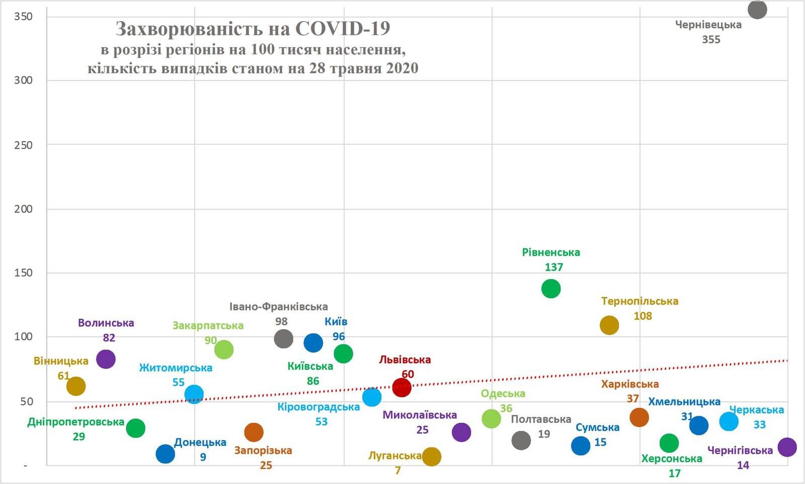 Тому, фахівці ЛОЦГЗ підготували графік, який відображає захворюваність на коронавірусну інфекцію по регіонах України з розрахунку на 100 тисяч населення, станом на 28 травня 2020 року.